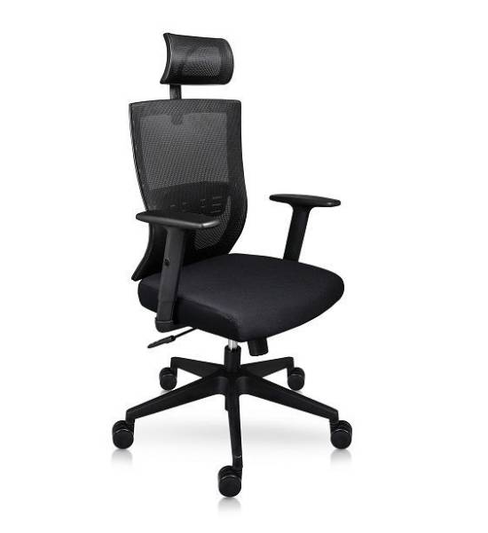 Silla ejecutiva athenas con cabecera tiene respaldo ergonómico con soporte lumbar ajustable en malla color negro, cabecera ajustable. Brazos de polipropileno ajustables de altura, asiento tapizado en tela color negro. Mecanismo ejecutivo reclinable con perilla de ajuste de tensión. Pistón para ajuste de altura y base metálica cromada con 5 ruedas dúplex.