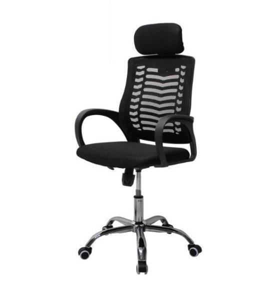 Silla Ejecutiva respaldo alto con cabecera y riñonera, en tela mesh color negro, asiento amplio tapizado en tela color negro, mecanismo ejecutivo, brazos de polipropileno con detalle cromado, base de estrella cromada.