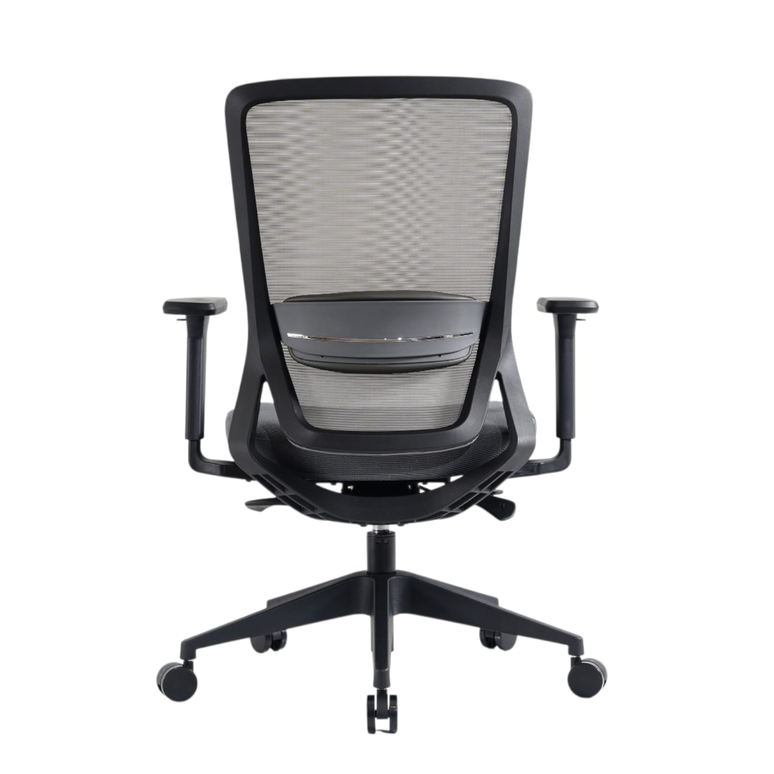 Silla Ejecutiva respaldo medio con soportes en malla color negro reclinable, con brazos en “T”, base de estrella con ruedas y pistón.