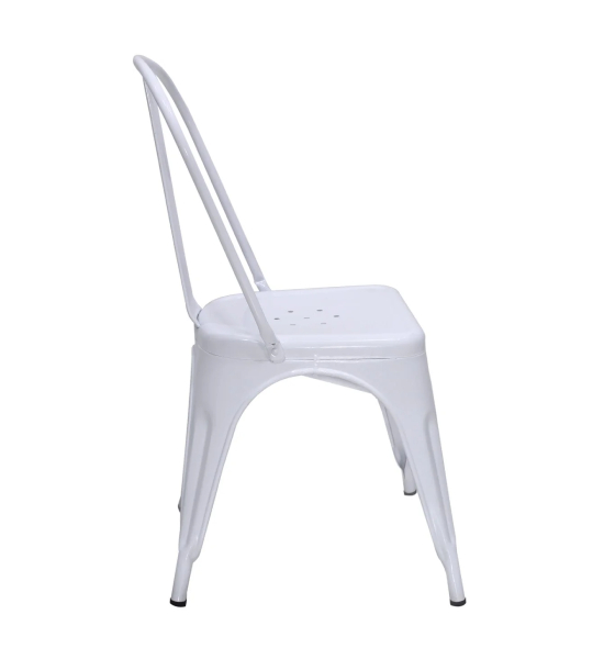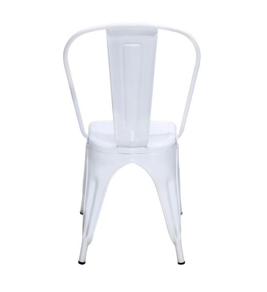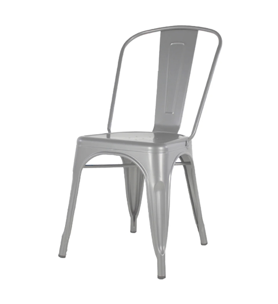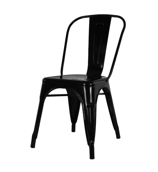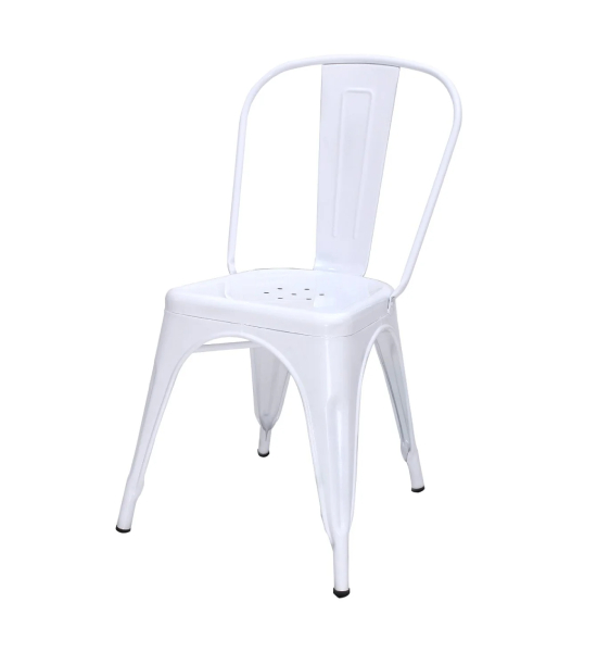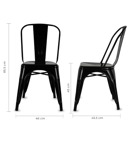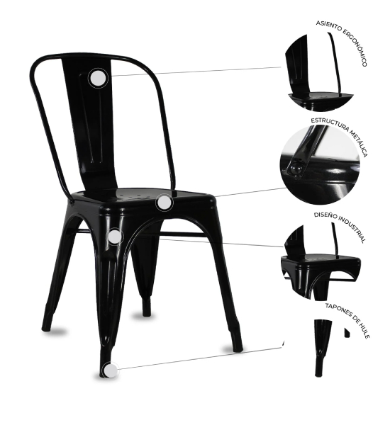 Silla metálica gante, estructura metálica maquinada con acabado en pintura electrostática, travesaño soldado de tubo 1/2°, tapones antiderrapantes de plástico. Respaldo metálico alto, atornillado con lámina metálica media troquelada. Ideal para cafeterías, restaurantes o en el hogar. Soporta hasta 100kg.