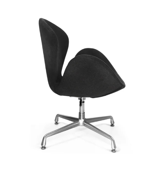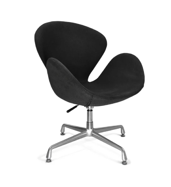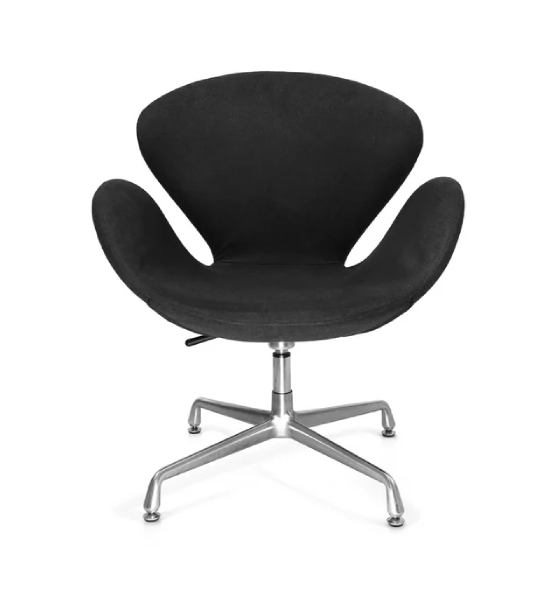 Este modelo de sillón Swan tiene un diseño moderno y cómodo; Base de aluminio pulido de 4 puntas con mecanismo giratorio y ajuste de altura por medio de pistón cromado. Asiento y respaldo en una sola pieza con forma ergonómica e interior de soportes de acero y espuma de poliuretano inyectado de 35mm, tapizado en tela color negro y gris.